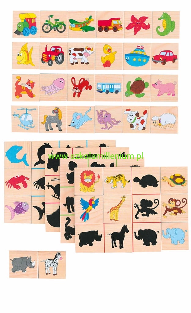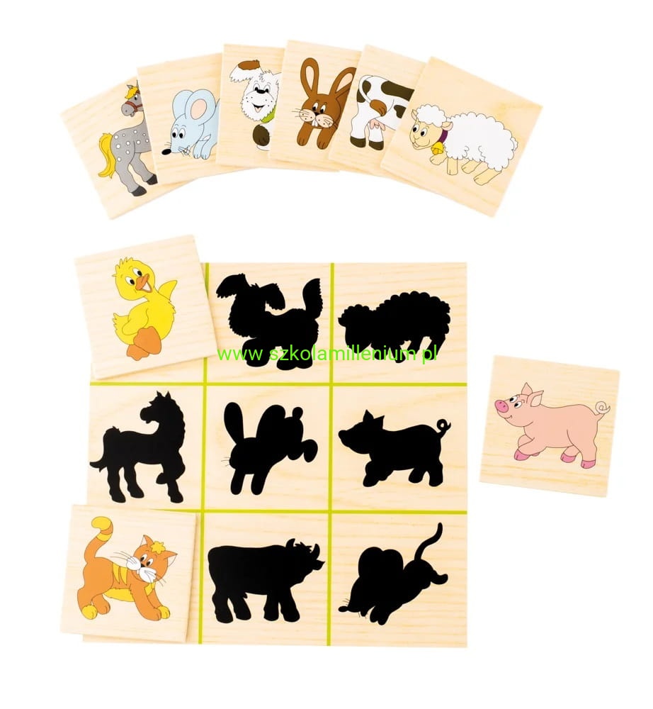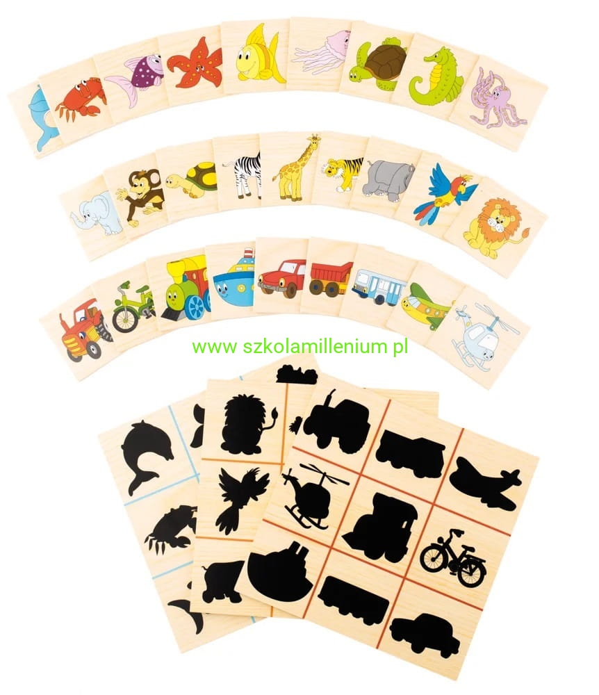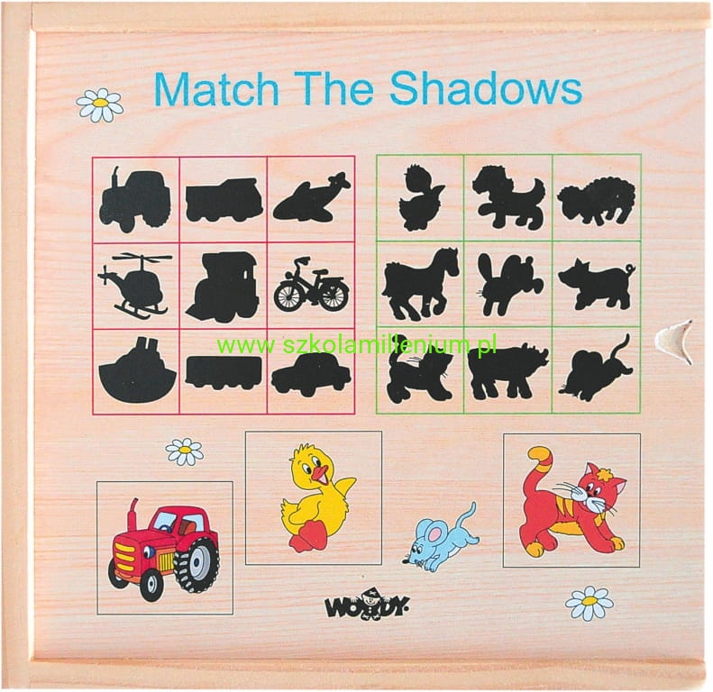 Układanka drewniana odszukaj cień wymaga od dziecka umiejętności kojarzenia i uruchomienia wyobraźni. Polega na łączeniu przedmiotu z jego cieniem, co stanowić nie lada wyzwanie. Zestaw zawiera cztery różne podstawy z cieniami, n każdej płytce po dziewięć. Obrazków jest 36 każdy z innym motywem: zwierzęta dzikie i domowe, pojazdy, zwierzęta morskie. Cały zestaw można schować załączonej drewnianej zamykanej skrzynce. układanka wykonana z wysokiej jakości drewna, a użyty lakier i farba jest nietoksyczna. Ta ponadczasowa zabawka będzie służyć przez wiele lat.