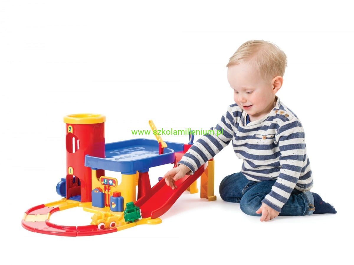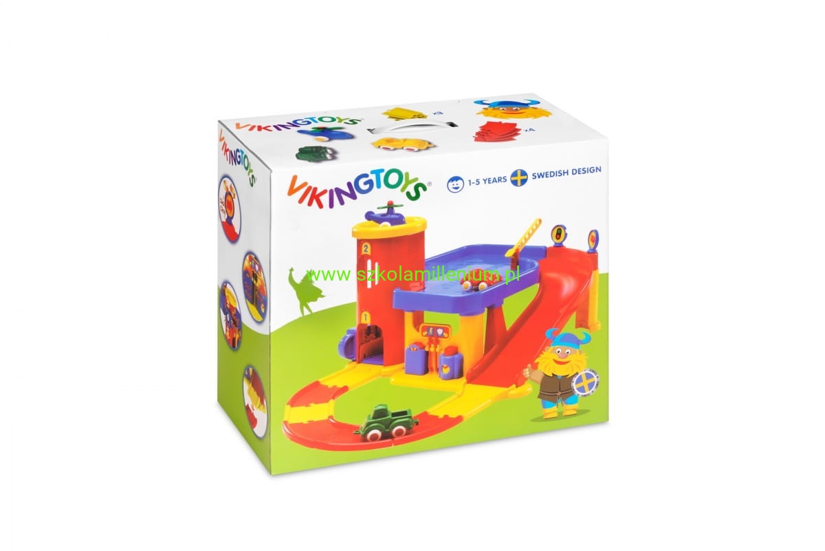 VIKING TOYS City garaż dwupoziomowy to zabawka, z którą nie sposób się nudzić. Na dole znajduje się myjnia, do góry można wjechać windą, która wzbogacona jest o efekty dźwiękowe. Na pierwszym i drugim poziomie znajduje się parking. Ponadto na drugim poziomie może wylądować helikopter. Z góry auta zjeżdżają trasą w dół. Do zestawu dołączone są 2 autka oraz helikopter. Viking toys to zabawki bezpieczne, proste, miękkie, ciche, a przede wszystkim wytrzymałe. Wykonane są z wysokiej jakości materiałów. Różnorodne, kolorowe pojazdy można łączyć w zestawy z garażami, co umożliwia ciekawą i kreatywną zabawę. Każde dziecko znajdzie dla siebie ulubione auto np. policja, taxi, ambulans, helikopter itp. Idealnie sprawdza się w trudnym terenie, jakim jest piaskownica czy też piaszczysta plaża, a po skończonej zabawie można go również myć w zmywarce.