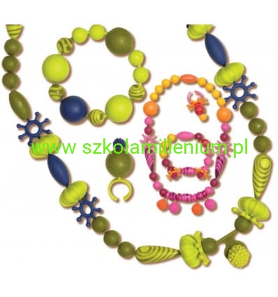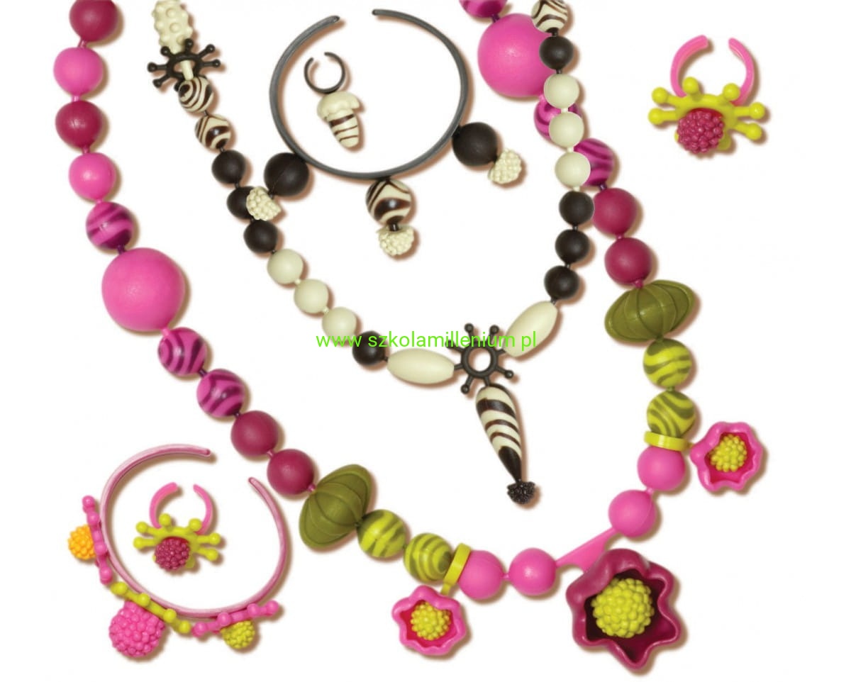 Zestaw do tworzenia biżuterii w praktycznym słoju z wygodnym uchwytem, zawiera 300 elementów, w tym 7 baz do pierścionków i 5 baz do bransoletek. Elementy nie nawleka się na sznurek, tylko wczepia jeden w drugi.