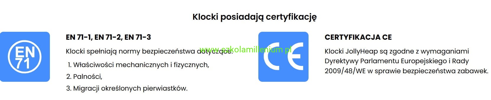 Klocki spełniają normy bezpieczeństwa EN 71-1, EN 71-2, EN 71-3 dotyczące: właściwości mechanicznych i fizycznych, palności, migracji określonych pierwiastków oraz CERTYFIKACJA CE zgodne z wymaganiami Dyrektywy Parlamentu Europejskiego i Rady 2009/48/WE w sprawie bezpieczeństwa zabawek.