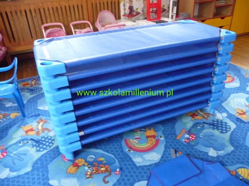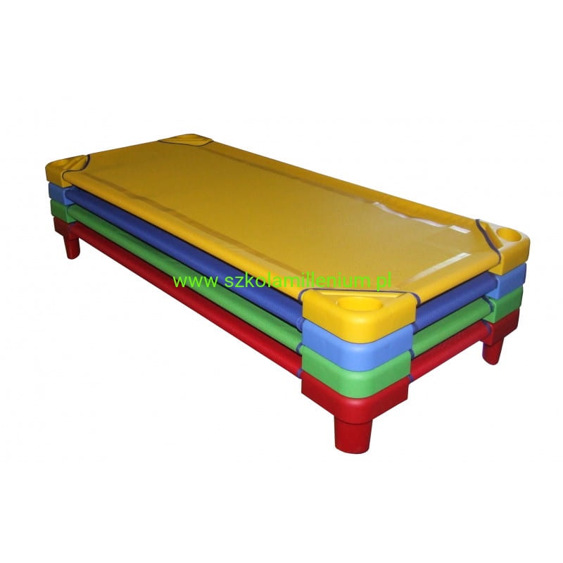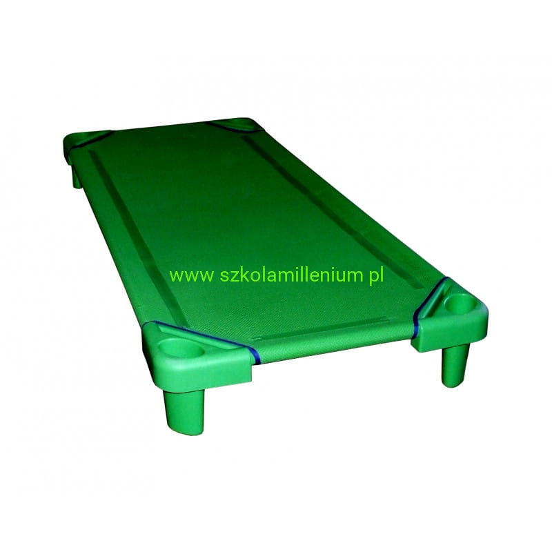 Leżak przedszkolny plastikowy na konstrukcji metalowej, pokryty siatką z tworzywa sztucznego, zaokrąglone plastikowe narożniki. Dzięki profilowanym otworom w narożnikach istnieje możliwość piętrowego składowania. bardzo lekki i łatwy do utrzymania czystości. Przeznaczony głównie do leżakowania dzieci w przedszkolach i żłobkach.