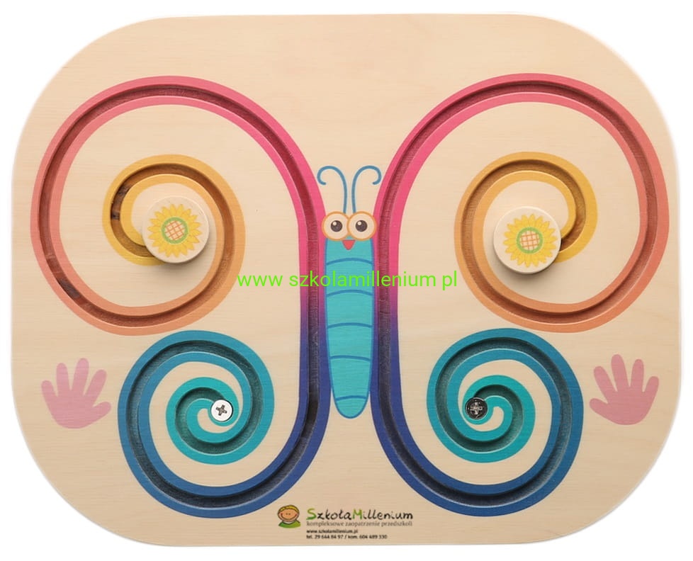Drewniana tabliczka z kolorowym motylem i wyznaczonymi torami, po których przesuwane są klocki w kształcie kwiatków. Za pomocą dwóch rąk maluch musi przesunąć klocki na drugi koniec trasy. Dzięki tej zabawce dziecko ćwiczy koordynację wzrokowo-ruchową oraz ćwiczy sprawność dłoni, która w późniejszym czasie ułatwi pisanie.