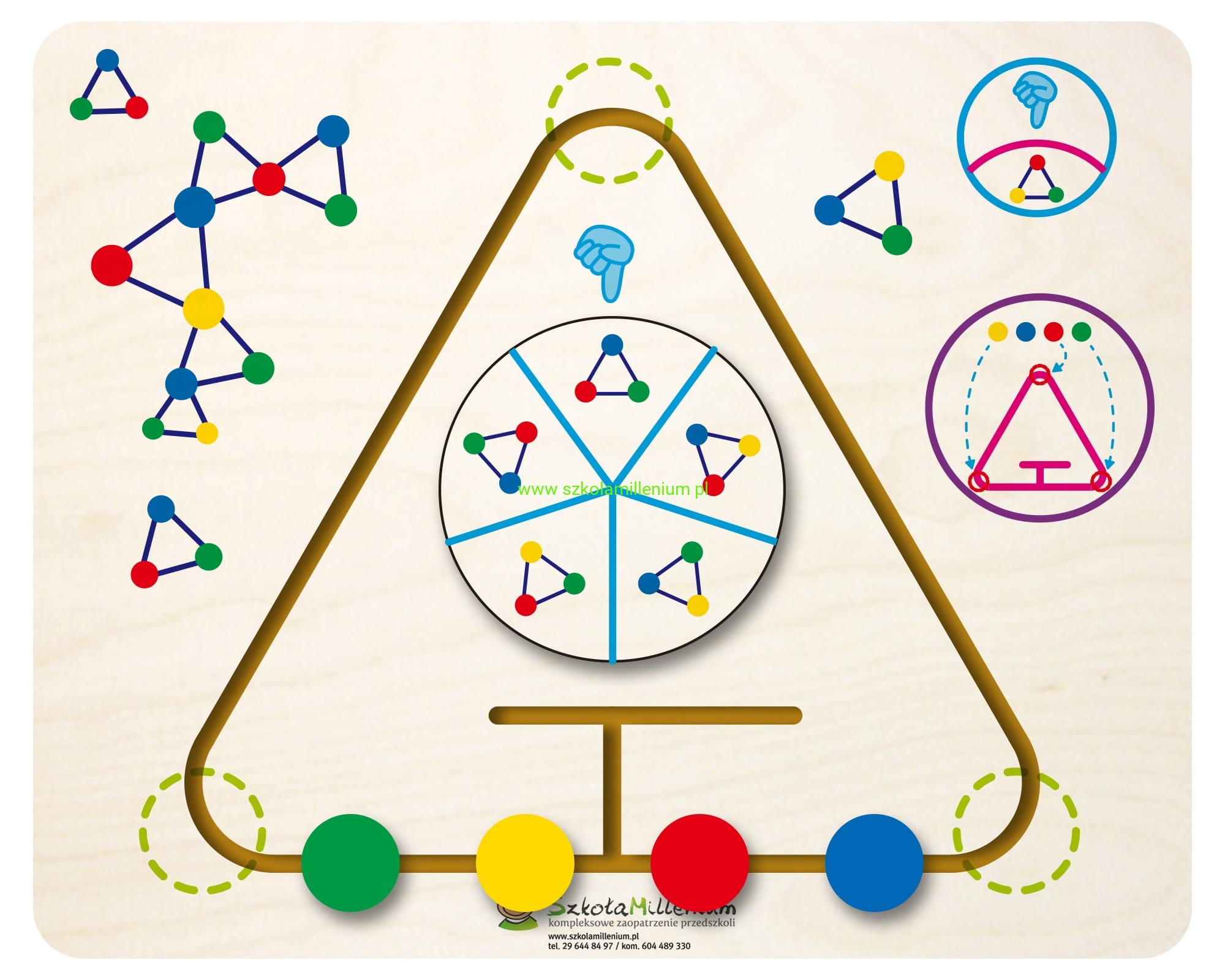 Przesuwanka trójkąt NK6 to drewniana tabliczka, na której wyznaczony został trójkątny tor po którym poruszają się cztery klocki w różnych kolorach. W środku znajduje się kółko z pięcioma obrazkami. Dziecko kręcąc nim losuje obrazek, który musi później odwzorować przesuwając klocki w trójkącie. Maluch nie tylko poznaje kolory, ale dzięki zabawce rozwija wyobraźnię, spostrzegawczość i trenuje koncentrację.